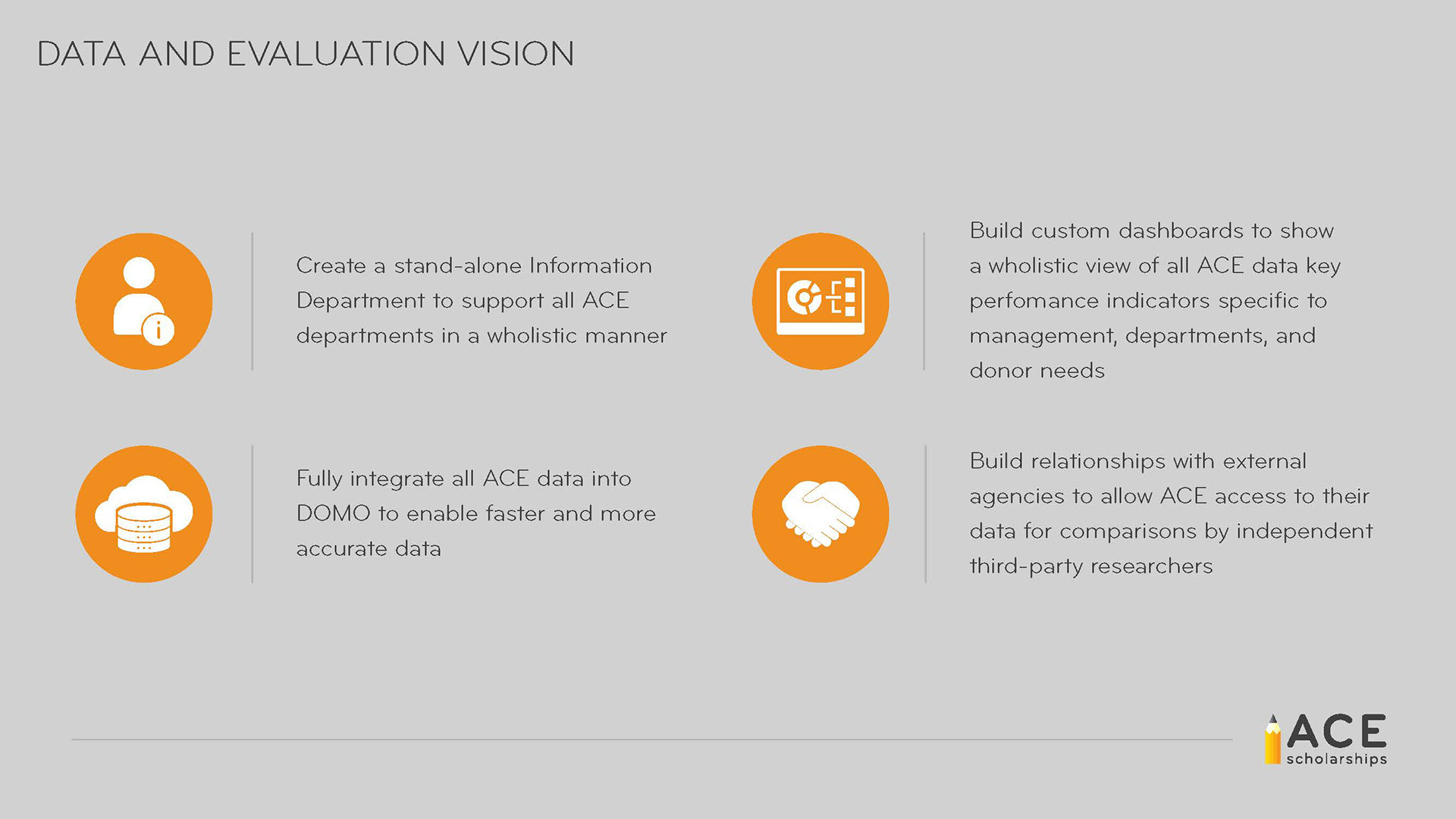 Project Overview: Create a dynamic presentation for ACE Scholarships showcasing their 2021 achievements and 2022 goals. This presentation will inform donors at the board meeting and annual vision summit about the organization’s impact and future plans.